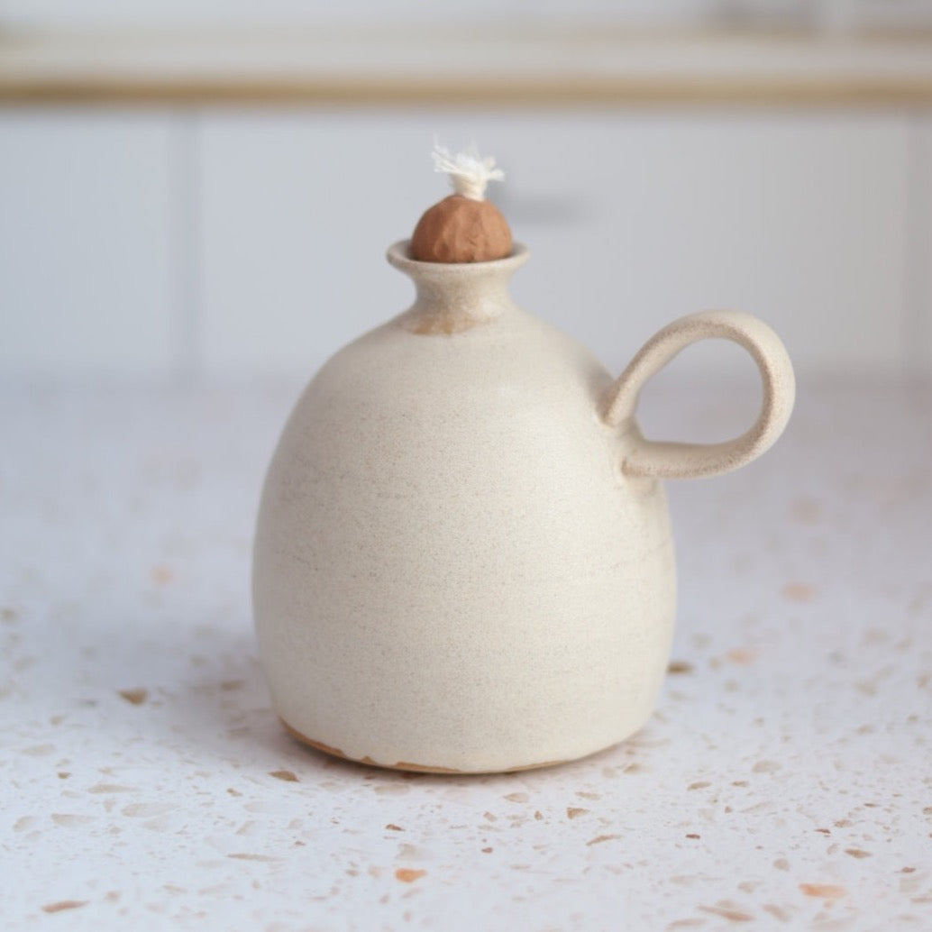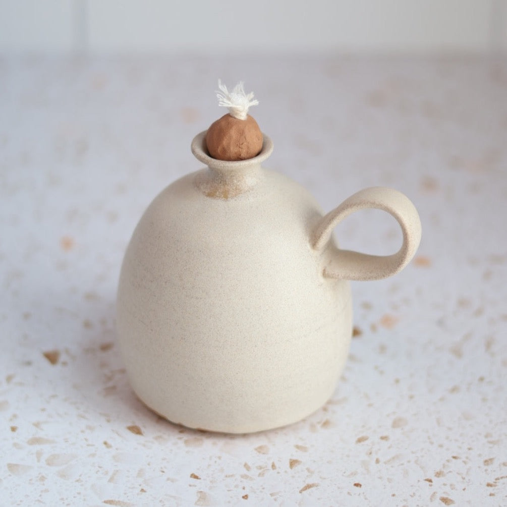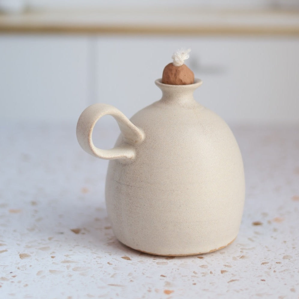 Set the mood indoors when you use regular lamp oil or enjoy a bug free time outdoors when you fill the handmade matte cream ceramic oil lamp with citronella oil.
