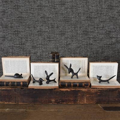 Curiously abstract yet delightfully adorable animal figures are cast of iron to add a touch of sculptural whimsy to any stack of papers, desktop or place setting.