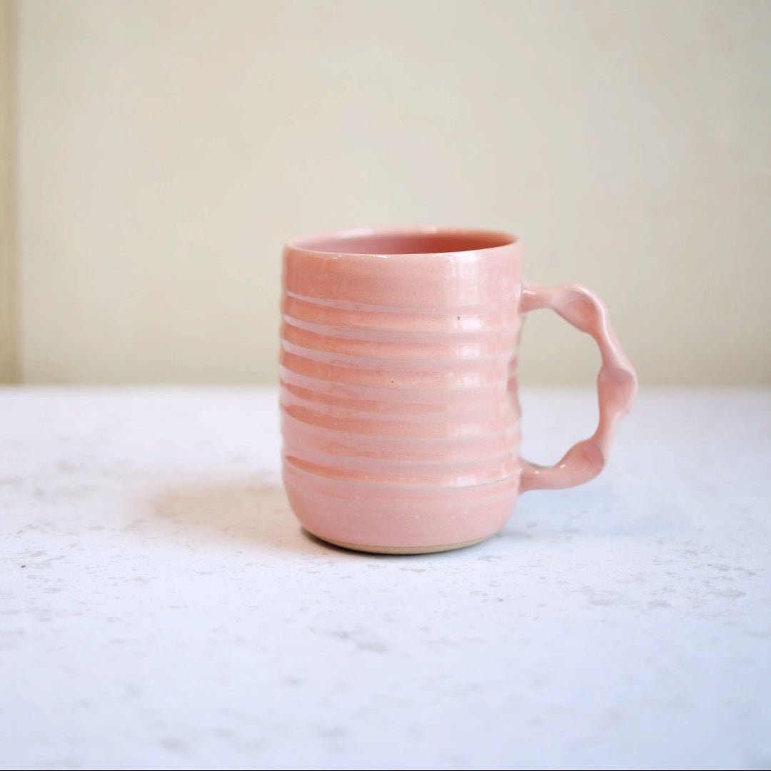 The blush pink glaze has a soft, peachy warmth that catches morning light beautifully. Fired on a light tan stoneware body, so you get subtle variations where the glaze breaks over the curves and edges.