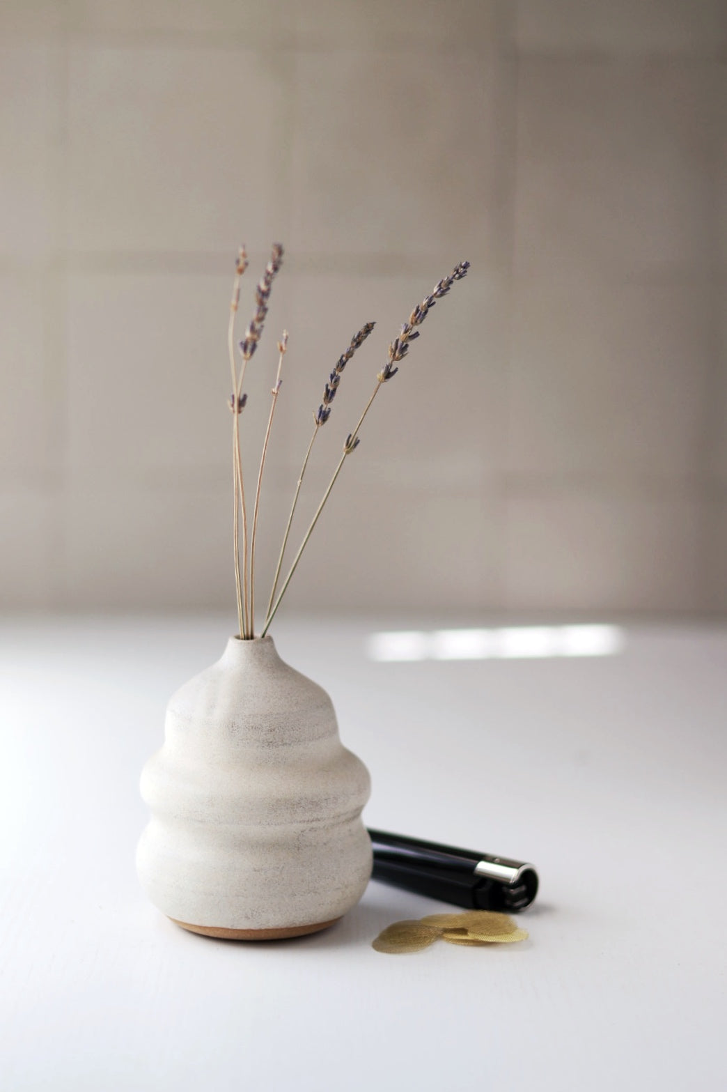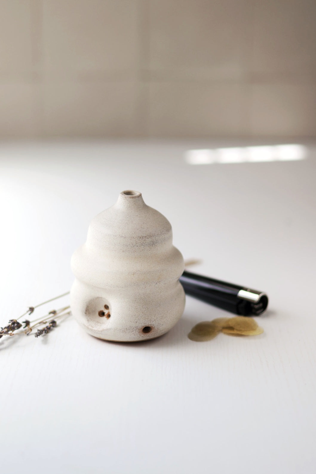 The set includes a one of a kind handmade Ruse Bud Vase, refillable Clipper lighter, pipe cleaner, screens and a few sprigs of dried lavender to complete the whole vase ruse tidily packed in a black giftable box.
