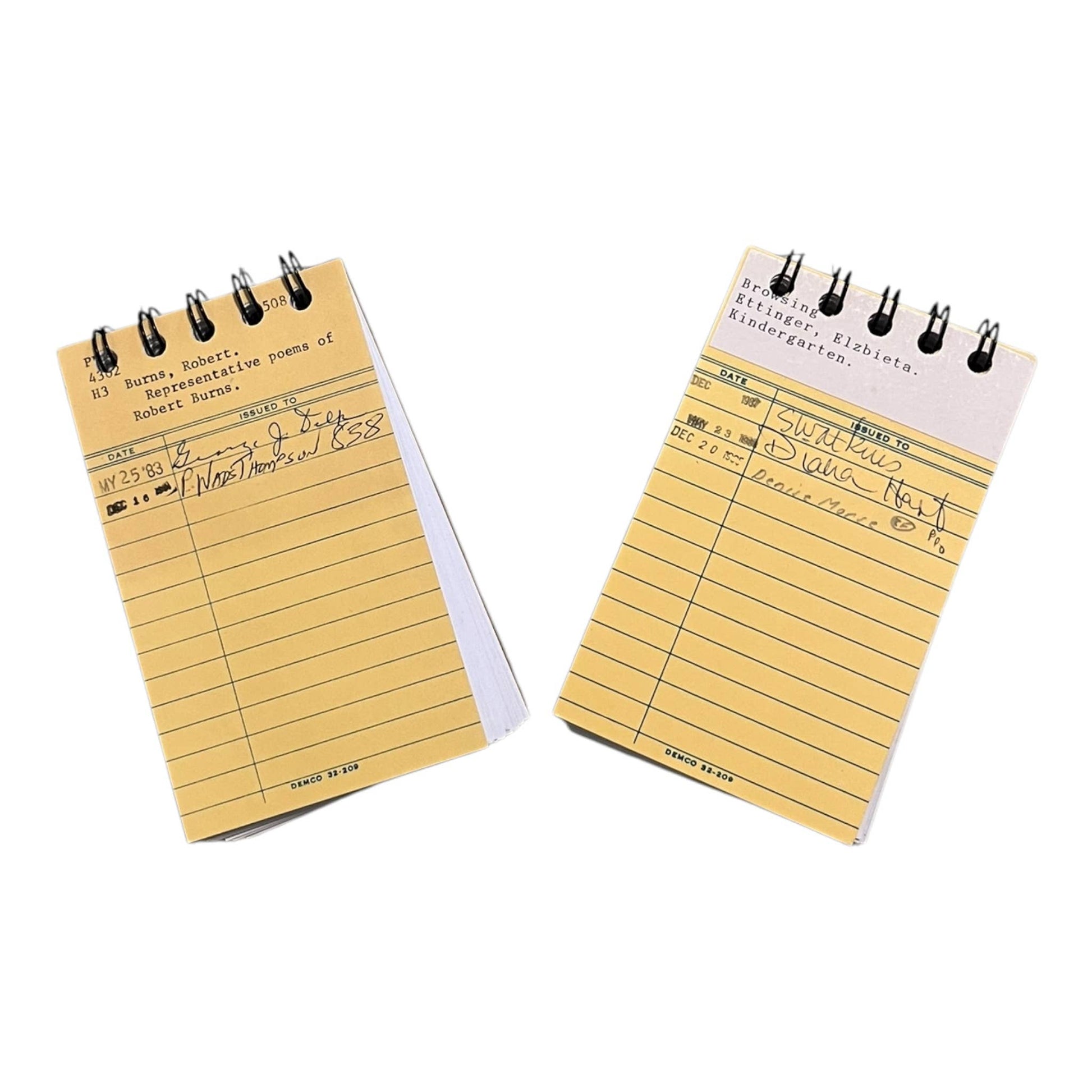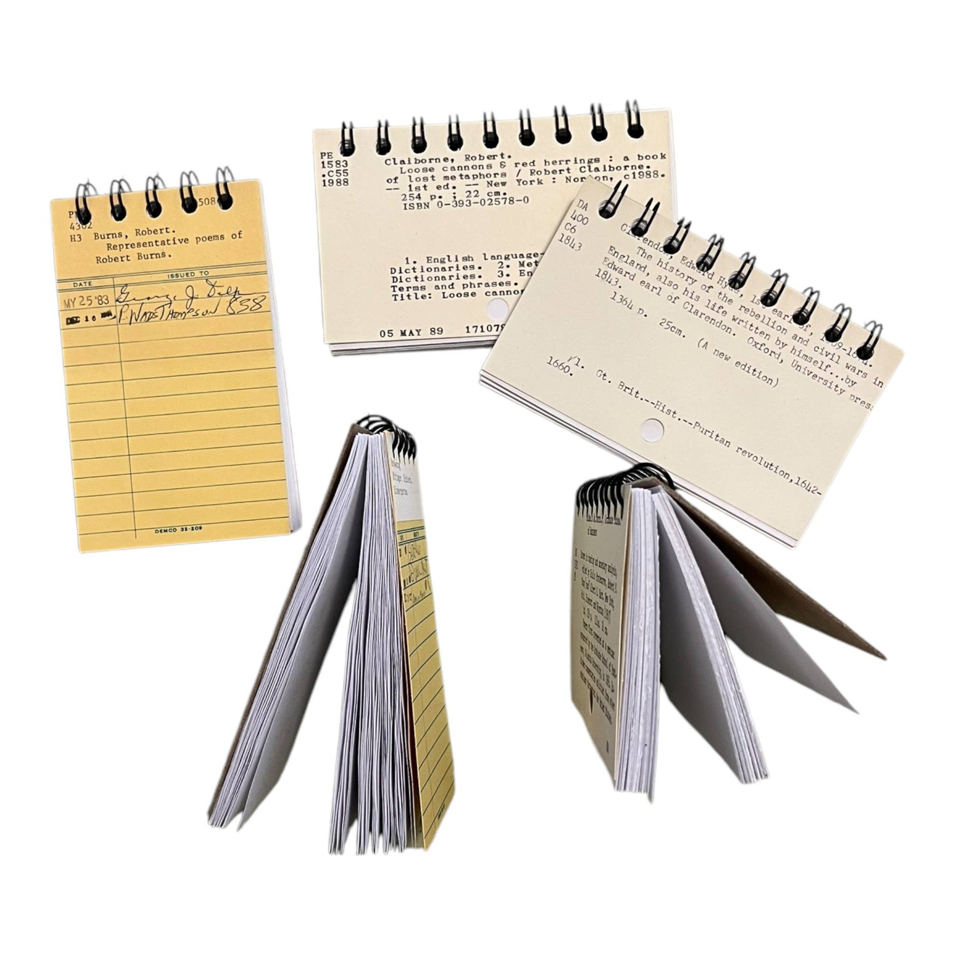 Rediscover the charm of libraries with our mini bullet journals made from authentic vintage library due date sign-out cards and card catalog cards!